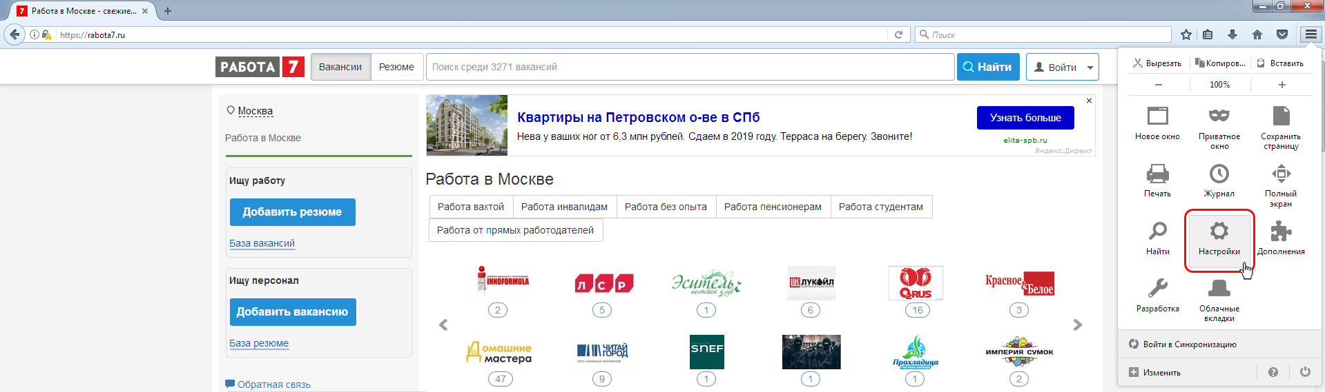 1. Откройте Firefox, нажмите кнопку меню(три горизонтальные полоски в верхнем правом углу экрана) и выберите настройки;