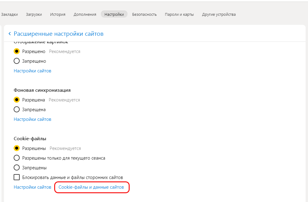 4. Далее нажмите "Все файлы cookie и данные сайтов";